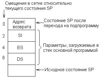 До речі, ми знову стикаємося тут з тією вельми звичайною ситуацією, коли програміст не має можливості звертатися по наочних символічних адресах, яких в стеку, природно, немає, а вимушений визначати "уручну" зсуву до елементів, що цікавлять його, стека. При цьому необхідно врахувати і алгоритм виконання команди call, яка, зберігаючи в стеку адресу повернення в основну програму, зміщує покажчик стека ще на одне слово.