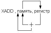 Команда xadd віконує в одній операції ськладання і обмін операндів. Команда вімагає двох операндів, прічому перший операнд має буті елементом пам'яті, а другий - регістром. Після ськладання операндів початковій вміст пам'яті переноситися в другий операнд (регістр), а отрімана торба запісується в пам'ять (на місце першого доданку) (малий. П13). Команда впліває на прапорі OF, SF, ZF, AF, PF і CF.